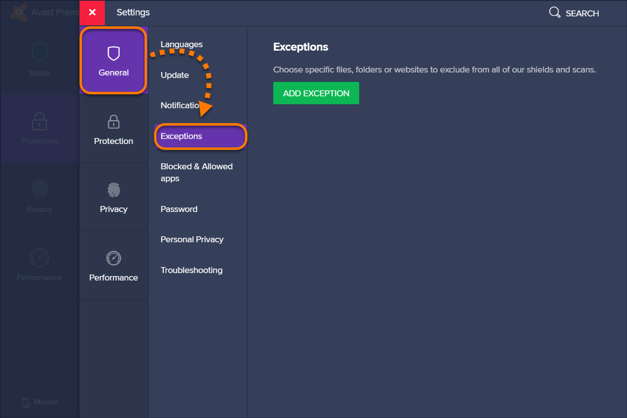 Setting global exceptions excludes individual files, entire folders, and websites from all scans and shields at once. Scans and Shields analyze all file, application, and web activity in real-time.